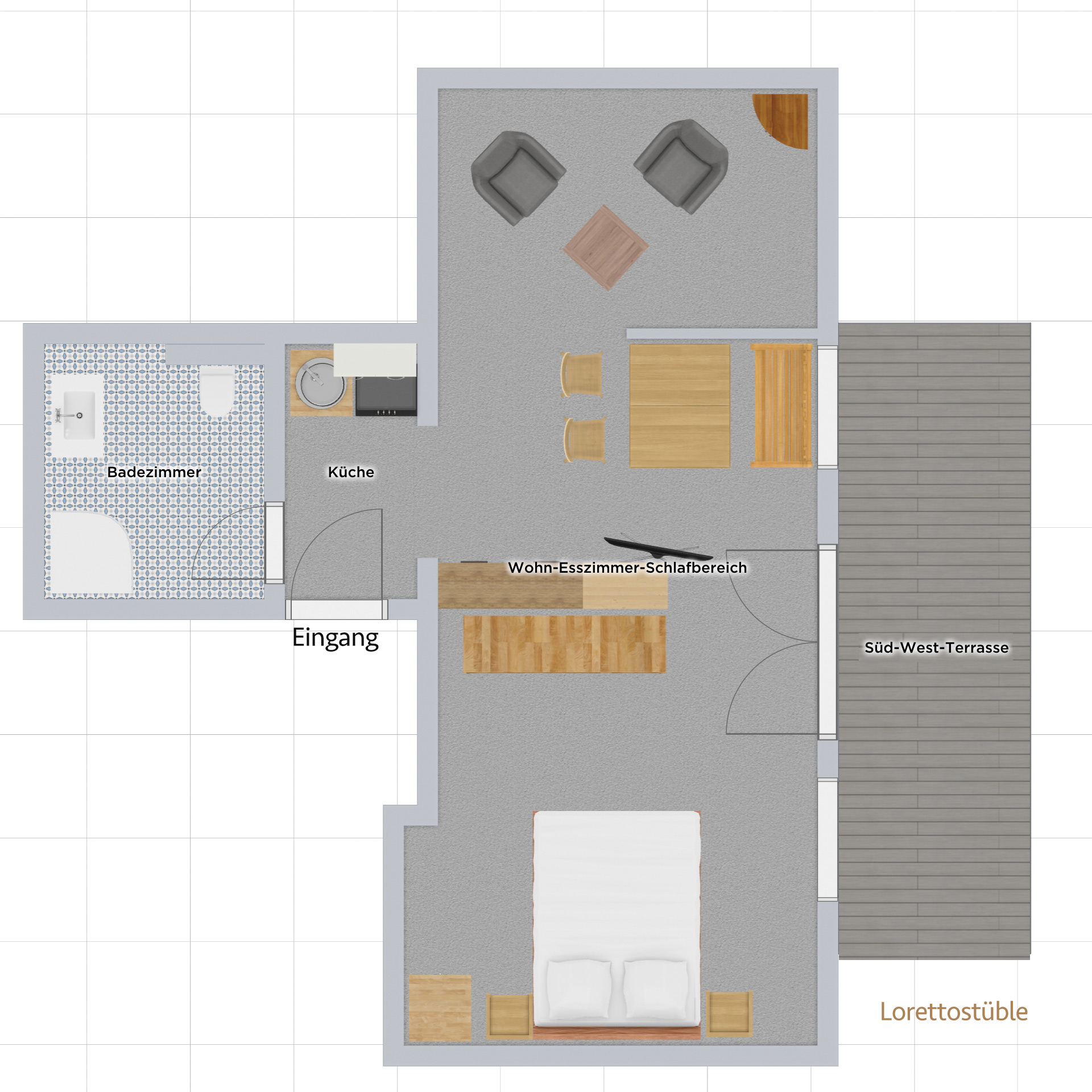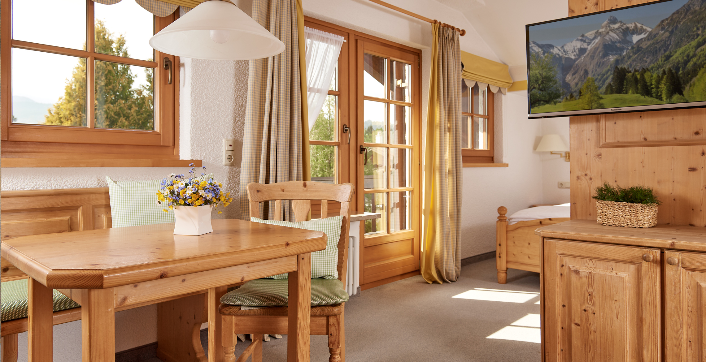 Das LORETTOSTÜBLE ist unser urgemütliches Alpendachgeschoss-Appartement, klein aber fein. Mit hübschem kombiniertem Wohn-Schlafraum im Landhausstil, gemütlicher Eckbank mit Bergblick und großem Doppelbett. Die kleine separate Küche ist mit allen erdenklichen Küchenutensilien ausgestattet.