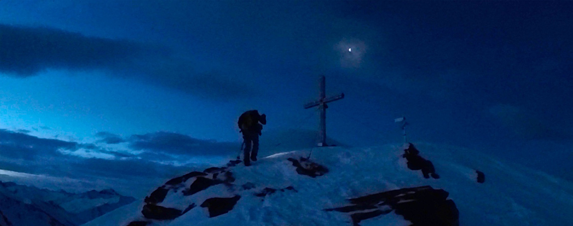 Am nächsten Morgen geht es um 6 Uhr, eineinhalb Stunden vor Sonnenaufgang, los. Die Aufstiegsroute zum Steinmandl war bereits am Vortag von der Hütte aus gut sichtbar. Noch mehr fallen aber die weiten, idealen Abfahrtshänge auf und lassen schon beim Aufstieg die Vorfreude wachsen.